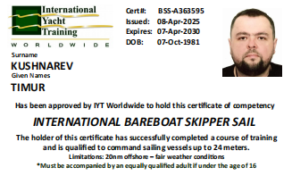 В яхтинг пришел интуитивно в 2021 году: начинал помощником шкипера, прошел обучение и практику у Ивана в Турции. Сейчас за плечами более 1000 морских миль.