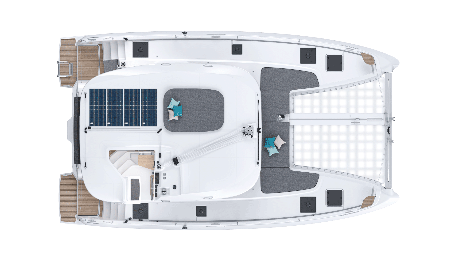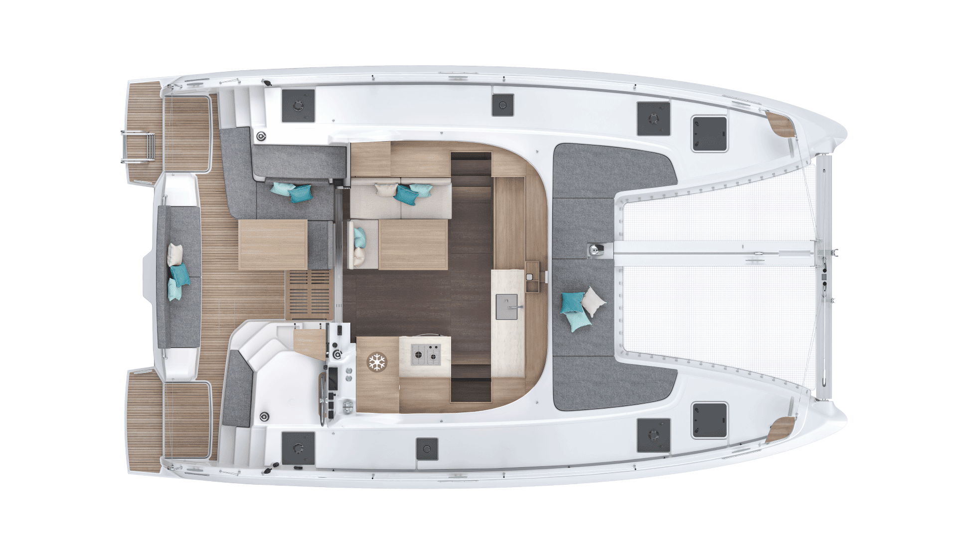 Раздвижная стеклянная дверь между салоном и кокпитом. Катамаран обладает самой большой в своем классе кормовой платформой. На носу еще одна просторная зона отдыха. Авто-стаксель, гик расположен низко: легко работать с парусами. Небольшая осадка (1.26 м) позволяет заходить в укромные мелководные бухты.