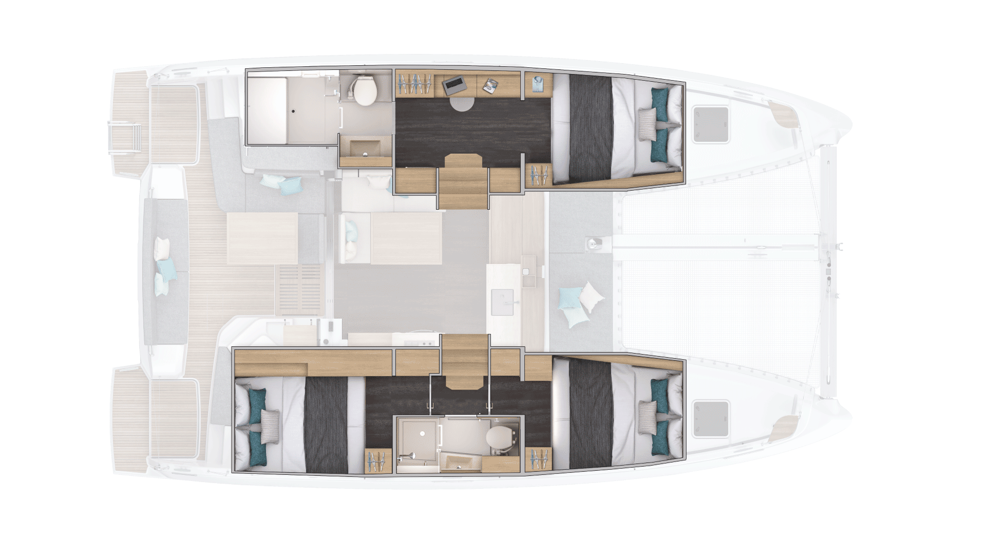 Интерьер продуман до мельчайших деталей, на этом катамаране можно жить круглый год. Панорамное остекление наполняет салон светом, создавая ощущение простора и единения с морем. Две версии планировки интерьера: 3 или 4 каюты. В трех-каютной версии один корпус целиком отведен для владельца катамарана: большая кровать, увеличенные шкафы для верхней одежды, отдельный санузел с душем. Во втором корпусе катамарана 2 гостевые каюты и 1 санузел. В четырех-каютной версии симметричные каюты и 2 санузла.