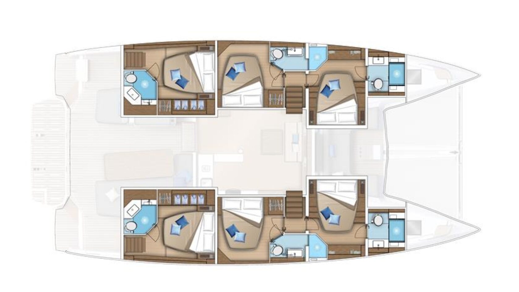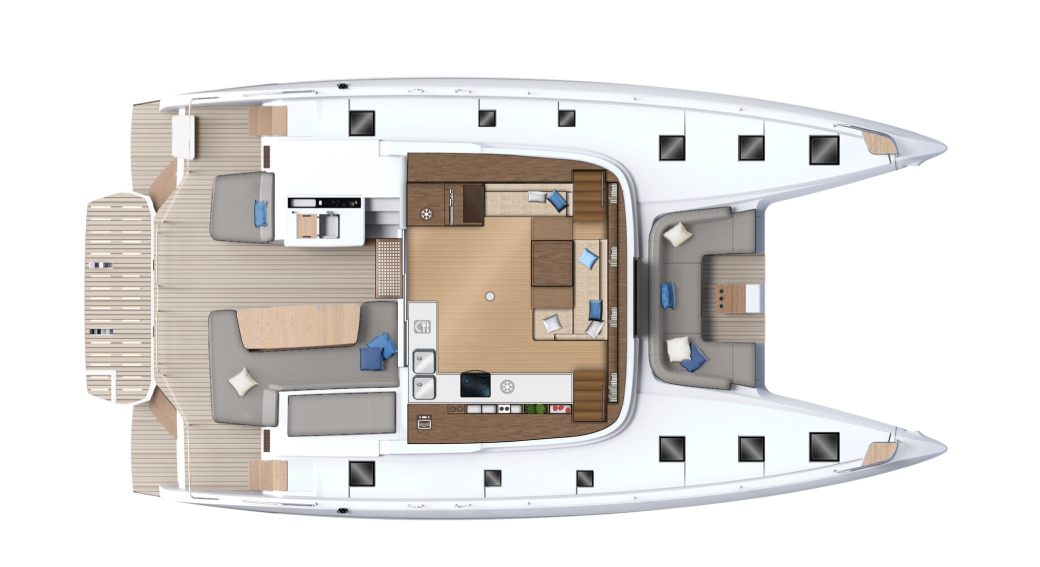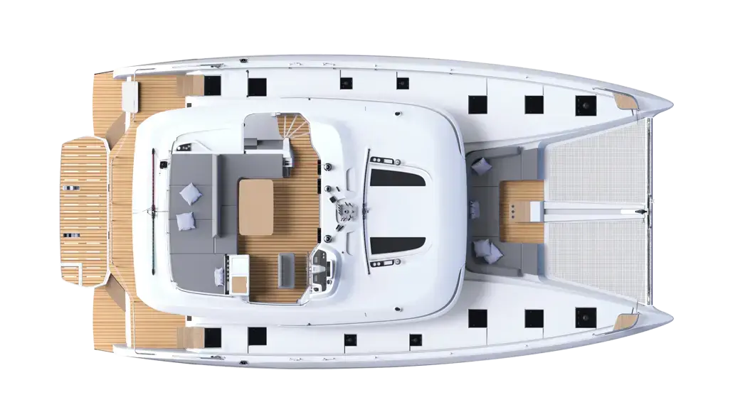 Основные черты Lagoon 55: узнаваемые обводы Lagoon, очень просторный кормовой кокпит с панорамным видом на воду, ступени на транцах, облегчающие доступ к воде, иллюминаторы в крыше рубки, широкий флайбридж, комбинирующий пост управления и зону для отдыха, удобный носовой кокпит.