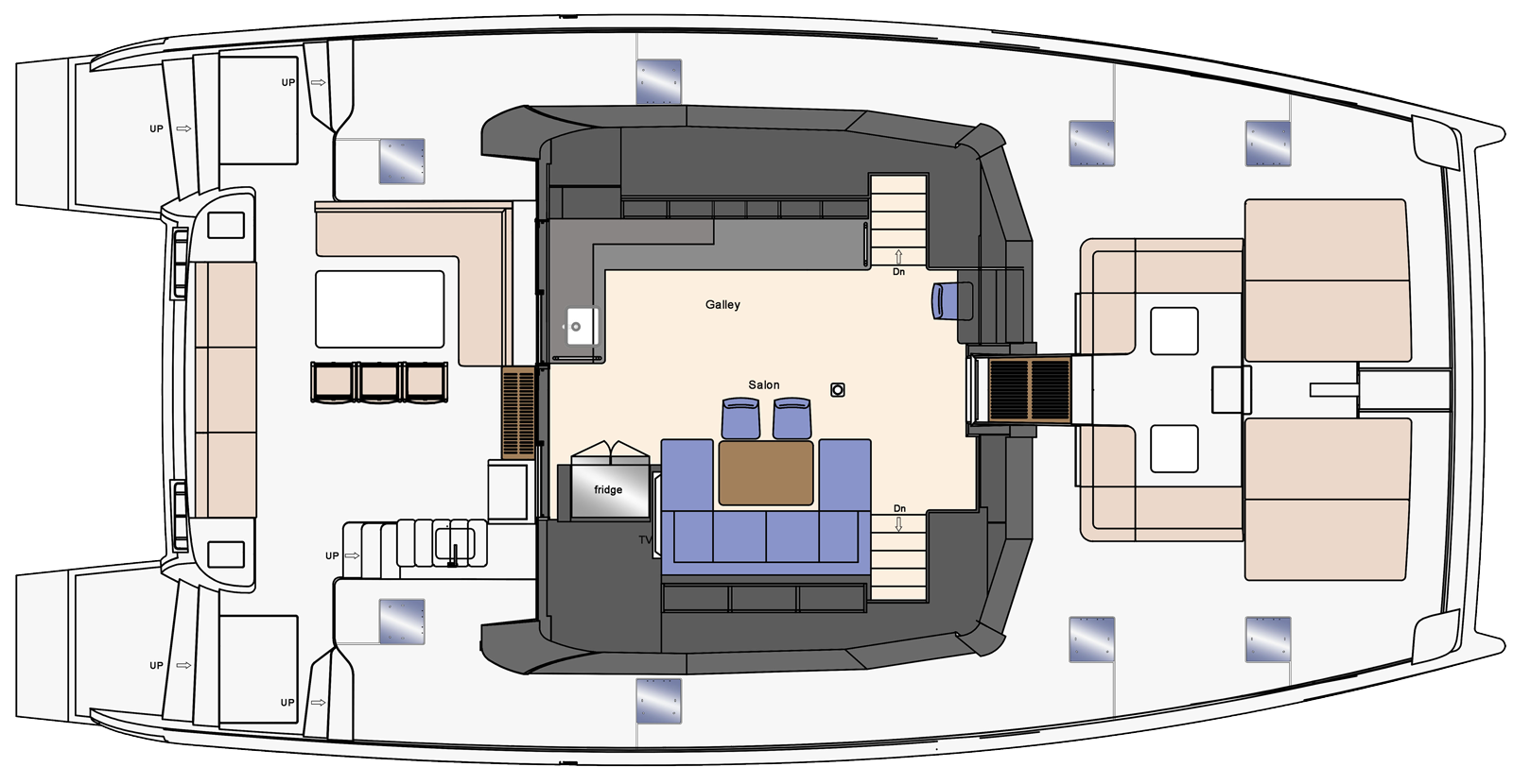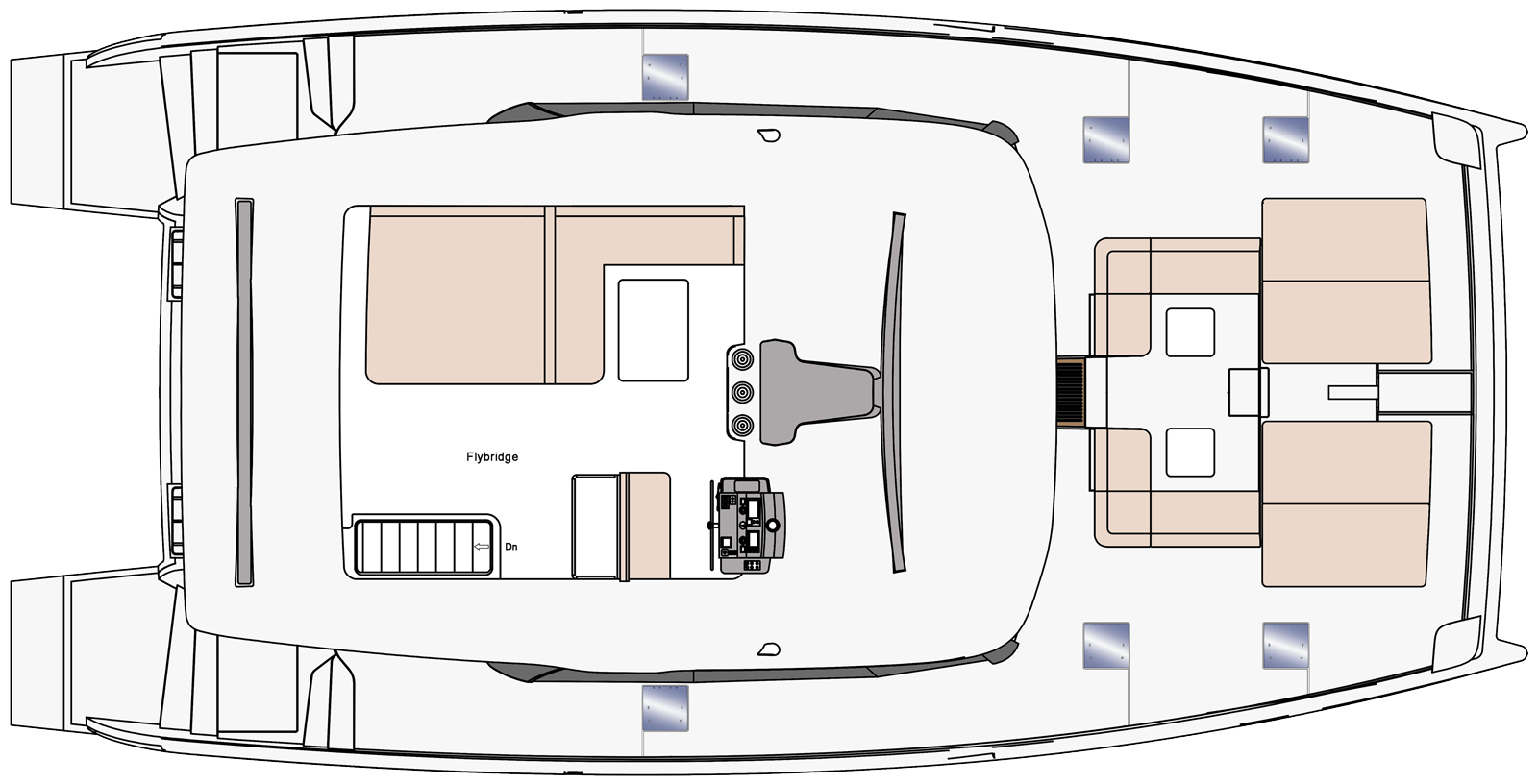 Носовая кокпит-зона с L-образными диванами и солярием через герметичную дверь соединена с салоном. Кормовой кокпит с мягкими диванами спускается к гидравлической купальной платформе — пляжному клубу у воды. Флайбридж с постом управления, баром и зоной отдыха открывает панорамный вид на 360 градусов.