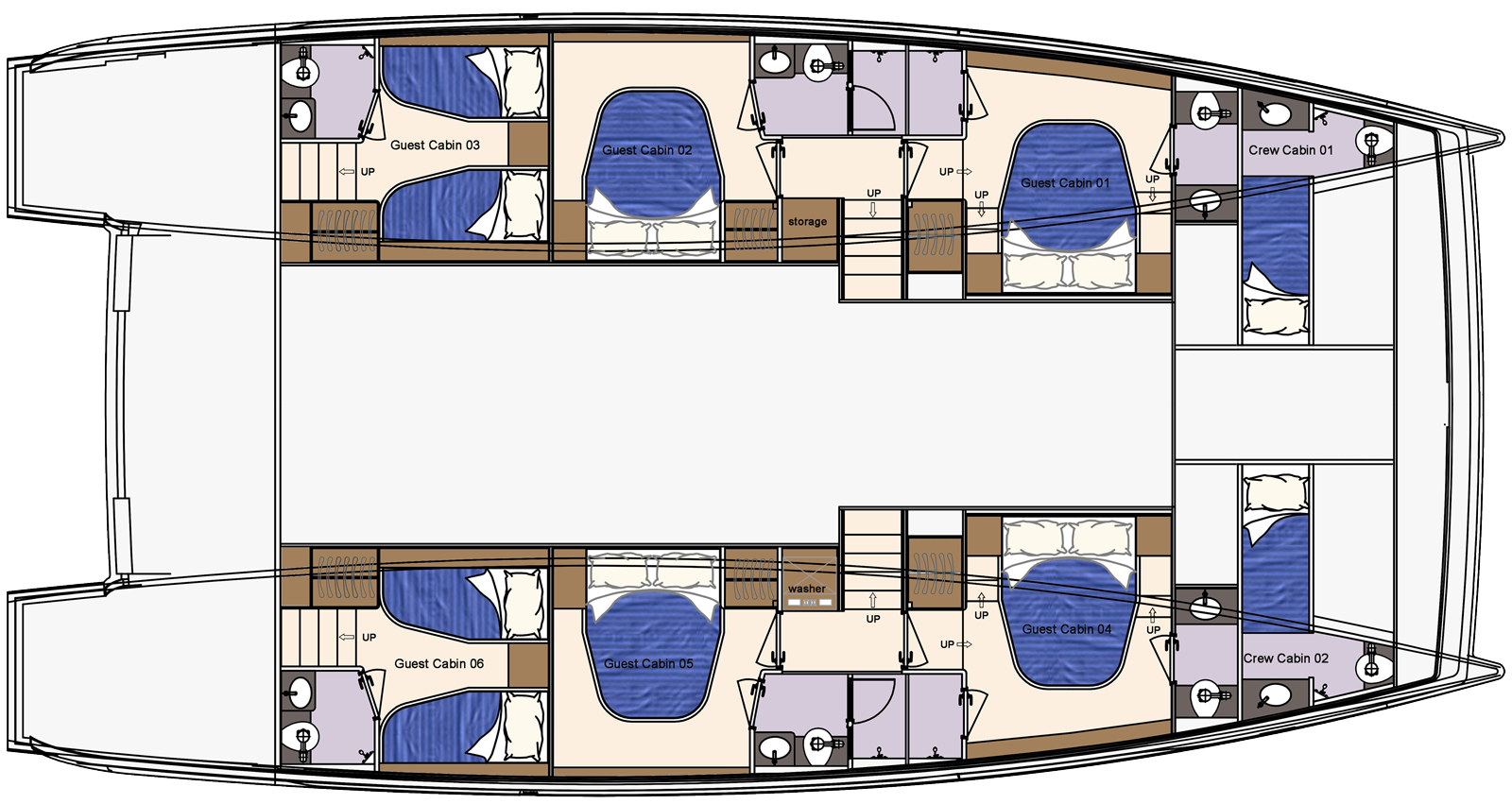 Внутри царит атмосфера элитного residence благодаря мрамору и тику в отделке. Просторный салон с панорамным остеклением и открытая кухня с двухдверным холодильником наполнены светом. Катамаран предлагает 6 кают, включая роскошную мастер-каюту с отдельной ванной и гардеробной.